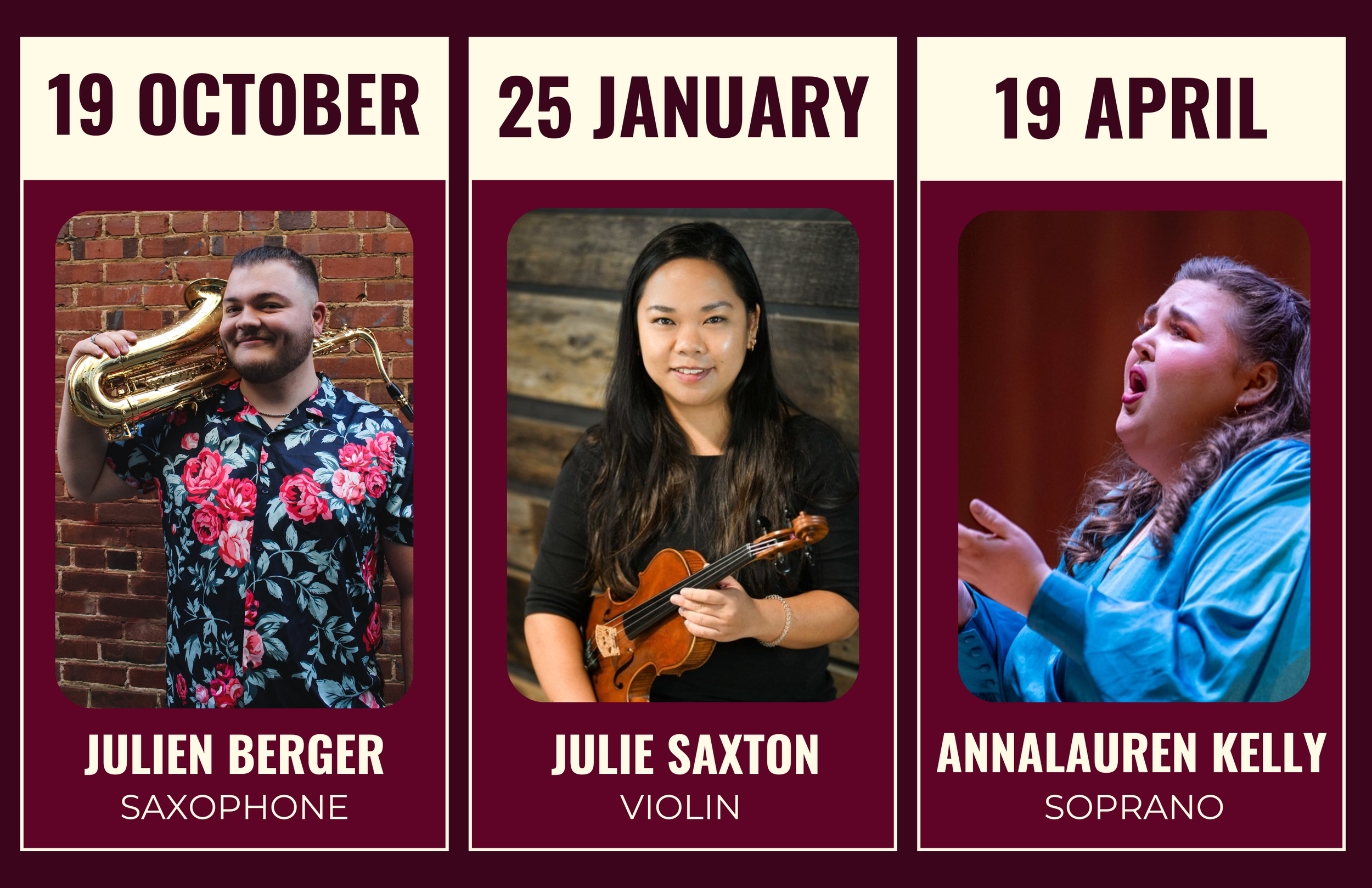 The DFAA Concert Series presents free concerts for the Decatur community featuring DFAA faculty and local guest artists. Our 2025-2026 season features saxophonist Julien Berger, violinist Julie Saxton, and soprano AnnaLauren Kelly, along with local guest artists.