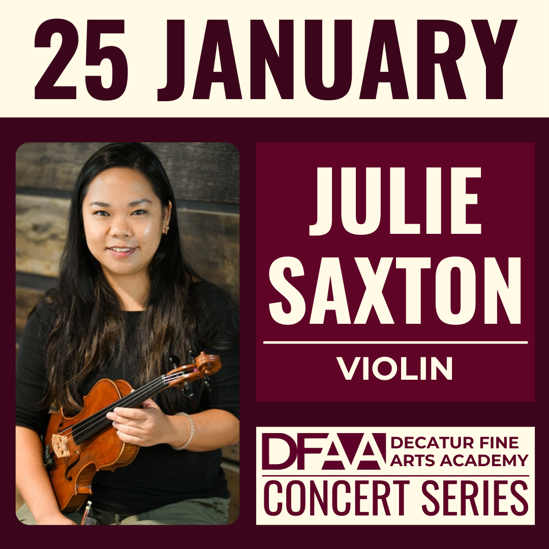 The DFAA Concert Series presents free concerts for the Decatur community featuring DFAA faculty and local guest artists. Our 2025-2026 season features saxophonist Julien Berger, violinist Julie Saxton, and soprano AnnaLauren Kelly, along with local guest artists.